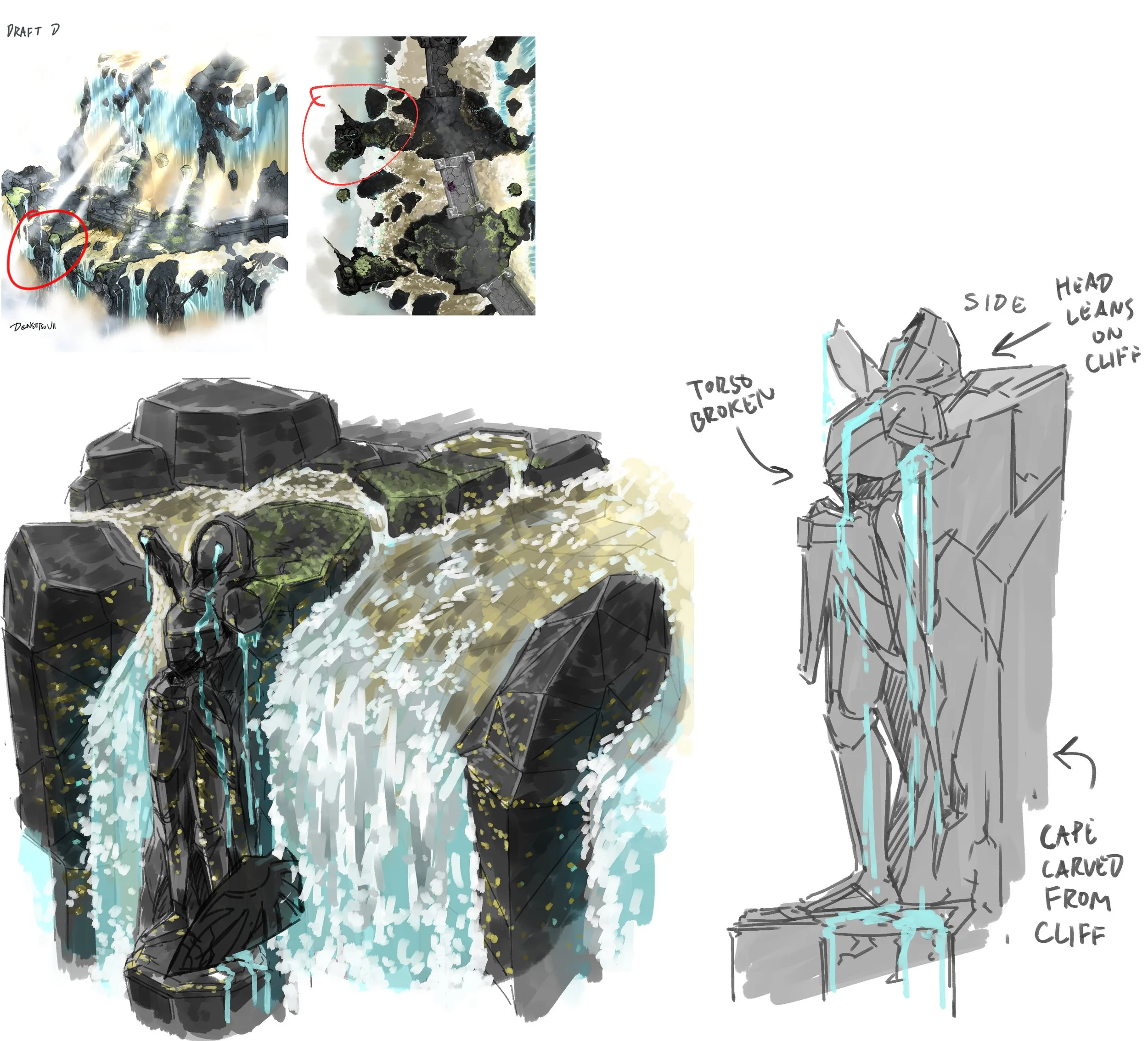 Attempt to develop the golden gate in such a way that it would be unrecognizable in closeup but still iconic in wide shots (so as to facilitate a reveal within the story). Used hanging tarp, which also gives the structure a sense of flow, and relying upon iconic red towers to read as ‘golden gate’.